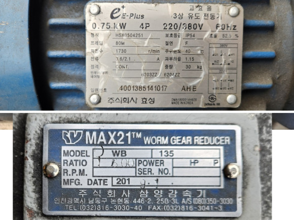 주13125 효성모터 1마력 삼상220V/380V 삼양 감속기 600대1 WB135 외관상태 사진참고 작동 정상 > 모터류