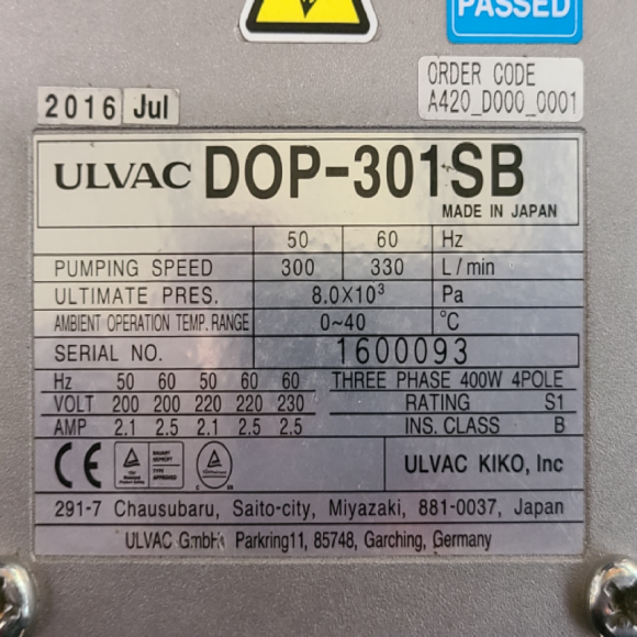 초33169/2단진공펌프/DOP-301SB/3상,220V/400W/ULVAC > 펌프