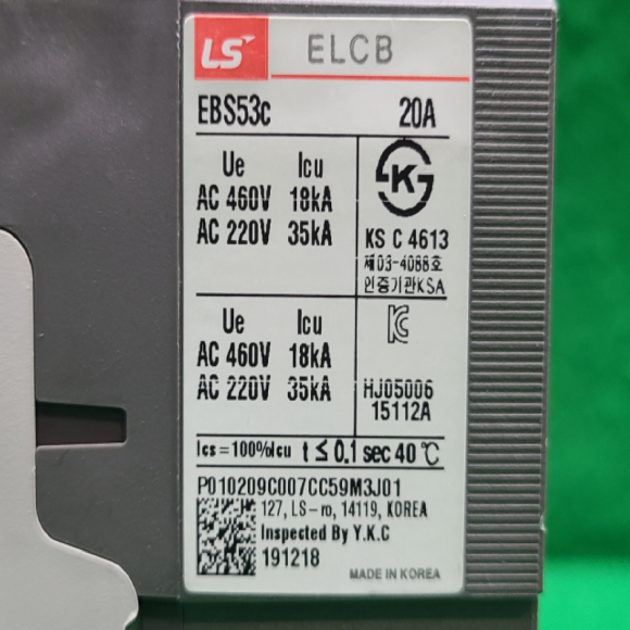 노19030/미사용누전차단기/EBS53C/20A/LS산전 > 전기자재류